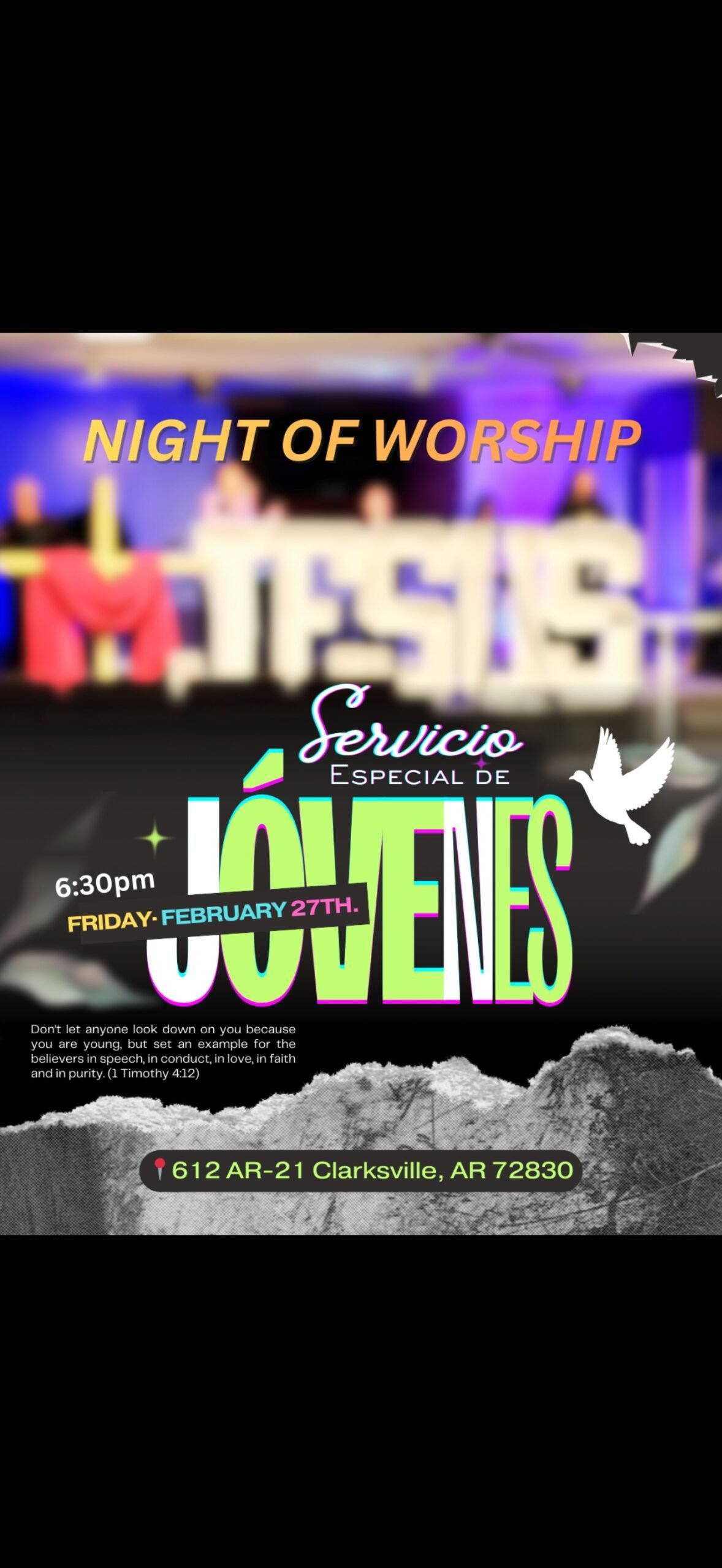 Servicio Especial de Jóvenes Servicio Especial de Jóvenes «Night of Worship» Viernes 27 de febrero, 2026 6:30 pm Dirección 113 N Fulton St Clarksville, AR 72830 + Añadir Google Calendar Exportación + iCal / Outlook 00 días 00 horas 00 minutos 00 segundos Fecha Feb 27 2026 Hora 6:30 pm - 8:00 pm Localización CW Church Jesucristo es Mi Refugio 612 AR-21 Clarksville, AR 72830 Compartir este evento